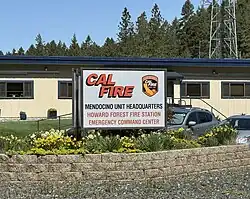 Howard Forest Station is a CAL Fire station and emergency command center (ECC) in Mendocino County, California, located along U.S. Route 101 and 5 miles (8 km) south of the city of Willits. The Howard Forest ECC serves as a secondary public safety answering point (PSAP) for fire and emergency medical services in largely unincorporated Mendocino County. The compound is also the location of the Howard Forest Helitack Base and serves as the headquarters of the Mendocino Ranger Unit.[1]