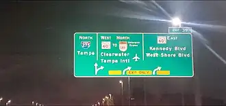 I-275 Northbound approaching Exit 39 with redesigned and updated sign after Howard Frankland Bridge section.