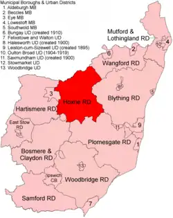 In 1934, under a County Review Order, Hoxne Rural District was abolished and its parishes transferred to Hartismere Rural District, and in 1974 to Mid Suffolk district. 3 parishes went into the new Blyth Rural District.