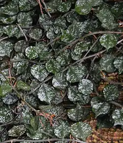 Hoya curtisii is a species of flowering plant in the genus Hoya. It is native to Southeast Asia across Thailand, the Philippines, Borneo, and Malaysia.[3] The species has easily recognizable foliage among Hoyas with small, pointed leaves and silver variegation. Like many Hoyas, it grows as a creeping epiphyte.[4]