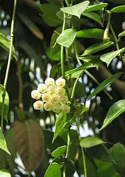 Its native range is Thailand through Borneo, Java, Sumatra, and the Philippines, and it is introduced in other countries as well.[1] Like most Hoya, it is an epiphytic vining climber. It has smooth ovate to lanceolate leaves,[2] and flowers that are scented like cinnamon.[3]