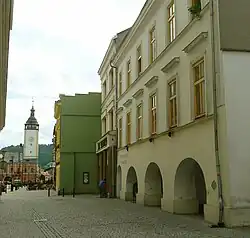 Since 1992, the historic town centre is protected as an urban monument zone.[4] The church of the Beheading of Saint John the Baptist is the landmark of the town square. The construction was finished in 1763. It is a massive Baroque-Neoclassical building with valuable decorations of the interior. The second significant building on the square is the old town hall. It served its purpose until 1998, when the offices moved to the premises of the castle. Today it serves as a library, a museum, and a concert hall.[16]