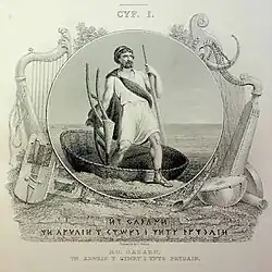 Engraving of Hu Gadarn from Ceinion Llenyddiaeth Gymreig (Beauties of Welsh Literature), an anthology of 1877