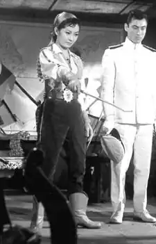 While in Taiwan, Huang sometimes went under the name Huang Baichi.[9] She was sometimes depicted in Taiwanese propaganda films as a national heroine. In 1959, the Japanese film studio Shintoho produced a film based on Huang's life, Queen of the China Sea (東支那海の女傑; Higashi shinakai no joketsu), in which she was depicted as a collaborator of the Japanese navy who falls in love with a Japanese soldier and ships much of her stolen booty off to Japan.[3] Huang was portrayed in the film by the Japanese actress Miyuki Takakura.[12] The film caused outrage in Taiwan and Huang hired a lawyer to sue the production company behind the film, Shaw Brothers Studio, for "slandering a national heroine". The Shaw Brothers swiftly sent representatives to apologize and were eventually forgiven by Huang after they donated 50,000 New Taiwan dollars to the "righteous compatriots of Dachen".[3]