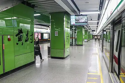 Huangcun station (Chinese: 黄村站; Cantonese Yale: Wòhngchyūn Jaahm), formerly Olympic Sports Center station (奥林匹克中心站; Oulàhmpāthāk Jūngsām Jaahm) when planning, is an interchange station between Line 4 and Line 21 of the Guangzhou Metro, and also the northern terminus of Line 4. It is located at the underground outside Guangdong Olympic Stadium in Huangcun Subdistrict (黄村街道), Tianhe District.[1] It started operation on 25 September 2010. Line 4 linking the Asian Games New Town outside Haibang Station with Guangdong Olympic Stadium plays a major role in carrying passengers during the Guangzhou Asian Games.[2] The station became a transfer station with Line 21 on 20 December 2019. It is located near the Tianhe East railway station.