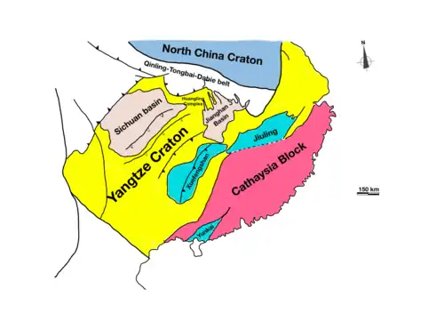 - ^ Chen, J.F. (1991). "Magmatism along the southeast margin of the Yangtze Block: Precambrian collision of the Yangtze and Cathaysia Blocks of China". Geology. 19 (8): 815–818. Bibcode:1991Geo....19..815J. doi:10.1130/0091-7613(1991)019<0815:matsmo>2.3.co;2.
