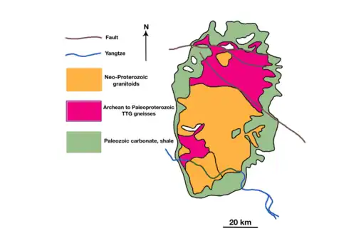 The Archean metamorphic rock was intruded by magma in the Neoproterozoic. It forms the core which exhibits an asymmetric dome-shape trending in a north-south direction.[3] The basement rock found in the northern part of the dome is called the Archean Kongling Complex. Magma intrusion made the northeastern part of the dome to be the Neoproterozoic granite.[8] During Archean, the Kongling Complex experienced three periods of magmatic activities that shaped the base of the Huangling Anticline. The oldest rock, the Kongling Complex, dated with zircon was formed 3.2–3.3 Ga dated. The oldest part of the formation does not show much exposure. The rocks formed a bit later, at 2.9 Ga, are widespread. The widespread old metamorphic basement rocks are TTG gneisses and trondhjemitic gneiss; they are well-exposed. To the east of the Huangling Anticline, granitic and granodioritic schists can be found; they were formed at 2.7 Ga.[8]
