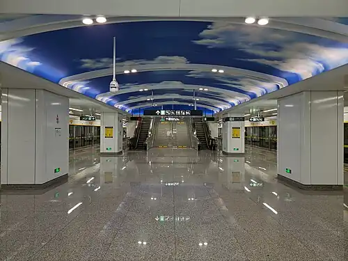 Huawu Station is themed around "Colorful Romance" (Chinese: “多彩浪漫”), featuring a free-form, streamlined grid that radiates a brilliant array of multicolored lighting effects. The illuminated strips balance aesthetic beauty with uniform brightness, while the organic, curved contours highlight the romantic and free-spirited nature of Huawu. The arched ceiling echoes the station's picturesque surroundings.[4]