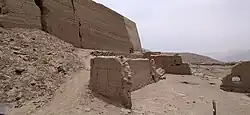 In Sector 2 (in front of the main entrance), a segment of an elevated walled road can be observed. This road was part of the network that formed the Qhapaq Ñan[15][16] during the Late Horizon. It connected Pariacha with other administrative centers in the valley, such as San Juan de Pariachi, Huanchihuaylas (now Santa Clara), Mama (now Ricardo Palma), and, through the Molle ravine pass, with Huaycán de Cieneguilla and the main Qhapaq Ñan road from Hatun Xauxa to Pachacamac in the Lurín Valley.