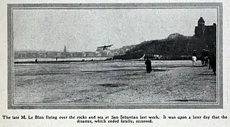 Le Blon drowned in a crash landing into the sea on 2 April 1910 while flying in stormy weather at Ondarreta Beach, San Sebastián, Spain, where he had been performing exhibition flights since 27 March. He was reportedly circling the Royal Palace of Miramar at about 140 feet when the Anzani engine failed; as he attempted to glide back to land, a wing's wire "stay" snapped whereupon the plane flipped and crashed into the sea upside down,[2][4] possibly colliding with some rocks.[1][4][9] His wife was among the crowd that was watching.[1][4][9]