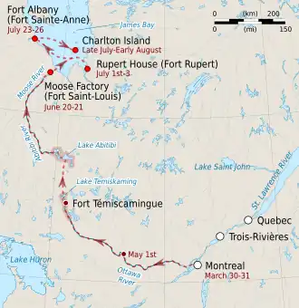 The expedition left Montreal in March 1686, and traveled more than 800 miles (1,300 km) over a period of 82 days. North of Fort Témiscamingue the route had not been explored by white men.[4] The route was up the Ottawa River to Lake Temiskaming, then over portages and down the Abitibi River and Moose River. When they arrived at Moose Factory, it was occupied by 16 men; its governor, John Bridgar, had sailed for Rupert House the day before. In the pre-dawn, brothers Pierre and Jacques Le Moyne led teams quietly into the fort, where they tied down its three cannons before launching an attack on the sleeping garrison. Pierre Le Moyne forced his way into the redoubt housing the defenders, but the defenders shut the gate behind him, and he had to single-handedly defend himself with sword and musket until his soldiers forced the gate open.[4] After a two-hour battle, the garrison surrendered.