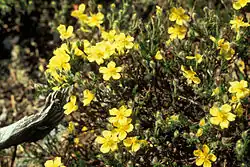 This is a small shrub forming low bushes up to 30 or 40 centimeters tall. The spreading stems are covered in green, needle-like leaves and the plant blooms in bright yellow flowers in June and July.[1]