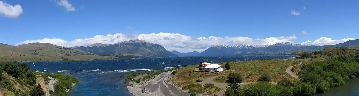 The lake's name derives from the Mapuche language and means long lake, an apt name for this 30 kilometres (19 mi) long, 5 kilometres (3.1 mi) wide lake, which has a surface area of 78.2 square kilometres (30.2 sq mi) or 19,300 acres. Lakes Paimún and Epulafquén are connected to the main body of the lake by short, narrow, shallow straits, but are usually considered separate lakes. These two smaller lakes would add about 30 square kilometres (7,400 acres) to the size of Huechulafquen Lake if the three were considered a single lake. The Chimehuin River flows south-eastward out of the lake with its ultimate destination the Atlantic Ocean. Junin de los Andes is the nearest city.[2]