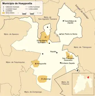 The municipal seat of Hueypoxtla, governs the following communities or towns: Santa María Ajolopan, San Francisco Zacacalco, Tinguistongo, Guadalupe Nopala, Emiliano Zapata, and Casa Blanca.[3] The municipality borders the municipalities of Apaxco, Tequixquiac, Zumpango, as well as the state of Hidalgo (Tizayuca, Tolcayuca, San Agustín Tlaxiaca, and Ajacuba).