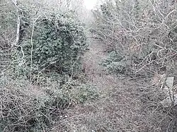 Hugglescote railway station is a disused railway station on the former Ashby and Nuneaton Joint Railway. It served the large village of Hugglescote where it joined the Leicester - Burton line and Charnwood Forest Railway. It closed in 1931[2] to passengers but closed to parcel traffic in 1951. Goods continued to pass through until 1965 when the line was closed from Coalville to Shackerstone. The site has since been demolished and is now overgrown. It was briefly used for a conveyor but this has since been removed. The photograph shows the site of the station yard, the station was immediately behind this point of view.