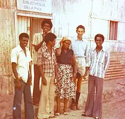 Pilkington visiting Djibouti in 1981 to assist refugee students to gain overseas scholarships in front of the library he assisted in establishing.