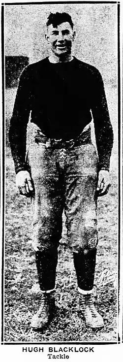 Hugh McNeal Blacklock (January 1, 1893 – January 9, 1954) was an American football player. He played college football at the tackle and fullback positions at Michigan Agricultural College from 1913 to 1916.[1][2][3] He also played seven years in the National Football League (NFL) at the tackle, guard and center positions. He played for the Decatur Staleys, the Chicago Staleys, the Chicago Bears and the Brooklyn Lions.[4]