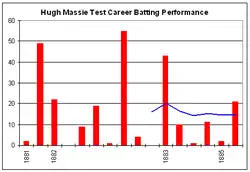 Massie's role in the 1882 Ashes Test at The Oval was almost as pivotal in deciding the result as Fred Spofforth's celebrated performance with the ball.[3] With Alick Bannerman as his opening partner, the hard-hitting Massie scored 55 in 57 minutes from just sixty deliveries, with nine fours, to give the Australians a chance.[4] They duly took the match to win by seven runs.