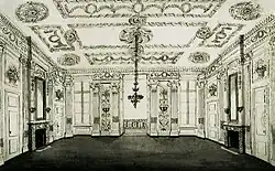 The large reception room on the second floor is at the front and extends almost the full width of the building. On the short sides, two mantelpieces face each other, flanked by doors behind which are small service areas. The long south side is dominated by double balcony doors and flanking windows. On the north side, toward the hall, there are also French doors. The ceiling and walls between doors and windows are richly decorated with 18th-century stucco decorations. Wide, fluted pilasters divide the walls into panels, in which are plastered with flower vases, flowers and fruit baskets and candelabra ornaments. The motifs used refer to at the time the newly discovered villas at Pompeii and Herculaneum.[3] Whether the stucco is by Petrus Nicolaas Gagini, who regularly collaborated with Soiron and who worked on the decoration of the House Eyll in Heer in the same year 1785, cannot be said for sure.[3]