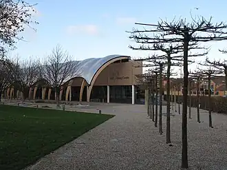 The building itself was designed by architectural firm Pringle Richards Sharratt with the goals of providing a highly accessible and visible structure, as well as a focus of local pride. The design of the upper floor features an environmentally controlled repository while the ground level features public spaces adjoined by a linear arcade overlooking a new park.[4]