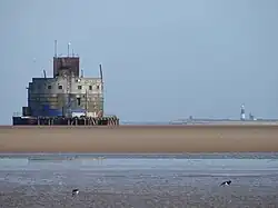 In 1960, a doctor's surgery, a grocer's shop, a general store and a café with a fish and chip shop were built. £19,000 was spent on more sea defences, including a "low wall of slag over clay, with an asphalt walk on top" together with the purchase of a lifeboat and a loud-hailer.[47] An additional safety measure was the installation of telegraph poles with a "bosun's chair" on the off-shore sandbanks. The idea was copied from Marshchapel with the hope it would “solve for ever” the danger of people's drowning as they got cut off by the rising tide.[48]