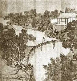 In 1513, Wang Xianchen, an Imperial Envoy and poet of the Ming dynasty, created a garden on the site of the dilapidated Dahong Temple which had been burnt during the Ming conquest. In 1510, he retired to his native home of Suzhou on the occasion of his father's death. He had experienced a tumultuous official life punctuated by various demotions and promotions, and gave up his last official post as magistrate of Yongjia county in Zhejiang province, and began to work on the garden.[3] This garden, meant to express his fine taste, received close attention from the renowned artist, Suzhou native, and friend, Wen Zhengming. The garden was named (first evidence around 1517[3]) after a verse by the famous scholar official of the Jin dynasty, Pan Yue, in his prose, An Idle Life, "I enjoy a carefree life by planting trees and building my own house...I irrigate my garden and grow vegetables for me to eat...such a life suits a retired official like me well".[4] This verse symbolized Wang's desire to retire from politics and adopt a hermit's life in the manner of Tao Yuanming. In the Xianju rhyme-prose, he writes 'This is the way of ruling for an unsuccessful politician'.[3] It took 16 years until 1526 to complete. Wen Zhengming wrote an essay Notes of Wang's Humble Administrator's Garden, and painted Landscapes of the Humble Administrator's Garden in 1533 including 31 paintings and poems to commemorate the garden.[4] Wen produced a second album of eight leaves showing sites in the garden in 1551, with different views but the same poems as in 1533.[3]