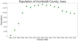 Humboldt County is a county in the U.S. state of Iowa. As of the 2020 census, the population was 9,597.[1] The county seat is Dakota City.[2] The county was created in 1857 and named in honor of Alexander von Humboldt.