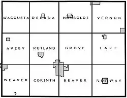 The Sixth General Assembly passed another act, reestablishing Humboldt County. The act was passed on January 28, 1857, and went into effect on February 26.[5] However, an error omitted the lower four townships (Jackson, Deer Creek, Badger, and Newark) from returning to Humboldt County. The error was not caught until the next session of the general assembly, and the general assembly passed a bill redefining Humboldt County to include the four townships on March 11, 1858.[6] However, in the interceding time, the Constitution of Iowa came into effect, including the provision that "future laws altering county boundaries should be submitted to a vote of the people of the counties concerned and must be approved by them before going into effect".[7] In a court case originating in the disputed area, the Iowa Supreme Court was asked to decide which county court had original jurisdiction. In their clarification, they ruled the March 11, 1858, clarification of Humboldt County's boundaries unconstitutional, as it had not been submitted to a public vote in the counties involved. In his decision, Chief Justice Ralph P. Lowe wrote, "We are compelled to conclude that township 90, in ranges 27 to 30, west of the 5th principal meridian, is still in and forms a part of Webster county. Of course we can pay no attention to conjectural surmises and vague suspicions, which have been made and entertained in relation to some unfairness which may have been practiced in the final passage of the act of 1857, creating the county of Humboldt. If such was the case, no evidence of the fact has been presented to us."[8] The "vague suspicions" include a rumor that John Duncombe of Fort Dodge (namesake of Duncombe, Iowa and plaintiff in the lawsuit) had tricked Humboldt County into ceding the southern four townships to Webster County "on loan", or was otherwise responsible for the "error".[9]