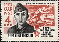 Hunan Avetisyan (Armenian: Հունան Ավետիսյան, Russian: Уна́н Мкрти́чович Аветися́н; 20 July 1914 – 16 September 1943) was a Soviet senior sergeant from the 89th Rifle Division who sacrificed his life by covering the embrasure of a German machine gun pillbox with his body so that his fellow soldiers could keep moving against the enemy in the Novorossiysk-Taman Operation of the Battle of the Caucasus. He was posthumously awarded the title Hero of the Soviet Union and Order of Lenin in recognition of his sacrifice by the Presidium of the Supreme Soviet of the USSR in May 1944.