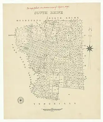The original name "South Rhine" is in reference to the Marne River (formerly known as South Rhine).[2] The North Rhine flows southwards through the hundred from its source at the north western boundary between Moculta and Keyneton (part of the western boundary between the Hundred of Moorooroo and Jellicoe) to join the Marne east of Eden Valley.