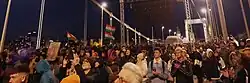 Hadházy announced another protest to the Elisabeth Bridge taking place on 25 March at 17:00.[62] The police rejected their request for permission to hold this protest at that place due to it disrupting traffic, instead they allowed it on the Március 15. tér. The Curia later found that the reasoning was not enough to reject the request.[63] Hadházy then announced that the protest will be held on the Ferenciek tere.[64] At the protest, thousands of protestors gathered.[65][66] Multiple speeches were made, then the protestors blocked the Elisabeth Bridge, Liberty Bridge, Petőfi Bridge, and Margaret Bridge. At 23:30, the police started to identify 289 of those who remained, two of them resisted.[67][68]