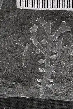 A further species, Hungerfordia fionae from the Late Devonian of South Africa is known from the largest sample, analysis of which suggests that variations used to differentiate between H. dichotoma and H. trichotoma may represent growth variations accountable by a single taxon.[3] Hungerfordia fionae fossils are as yet only recorded from the Waterloo Farm lagerstätte in Makhanda, Eastern Cape, South Africa and were first mentioned in the literature in 1991 as ‘terminally-lobed algae’ by Fiona Taylor.[3] With further excavations, in subsequent years, hundreds of specimens of Hungerfordia have been collected, which are housed within the Devonian Ecosystems Laboratory, Albany Museum in Makhanda, Eastern Cape - (with further good examples still being added to the collection during ongoing excavations (2021) by the research team of the Devonian Ecosystems Project). Hungerfordia fionae comprises dichotomous axes and is differentiated from other species by the presence of small bud-like appendages along the margins, which are preserved in a minority of specimens, and may more commonly have been shed in life or during transport. These have been compared to buds produced during the fertile phase of modern Rhodophyte algae.[3] It is believed that H. fionae probably lived in the more marine dominated portion of the Waterloo Farm estuarine system and were drifted further into the estuarine lake system through tidal action. Here they were preserved in large numbers due to anoxic bottom water and still water conditions that allowed for unusual preservation of soft tissues.[4] They are often preserved alongside charophyte algae, representative of fresh to brack conditions, demonstrating the dynamic salinity clines in the estuarine environment, as well as fragments of terrestrial plants and estuarine fauna.[4]