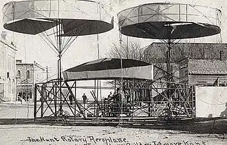 In 1910 A. E. Hunt, a blacksmith, resident in Jetmore, Kansas, designed and built a helicopter, which was referred to as a Rotary Aeroplane.[1][2] The craft was described as being of all-metal construction, made of pipe, tin sheets and angle iron. It's been variously estimated to weigh between 4,000 and 8,800 lbs (1,800 and 4,000 kg).[3][4] It was equipped with a 40 hp (30 kW) six-cylinder engine.[2][3] The fuselage consisted of an open framework, with a flat floor, vertical sides, and an arched canopy. It was equipped with a four-wheeled undercarriage.