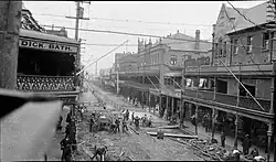 By 1900, Hunter Street stretched from its original eastern terminus to Dairy Farmer's Corner. In this year, 26 hotels were operating along the street with the majority of buildings concentrated east of the intersection with Darby Street. Development gained momentum after the introduction of steam trams in 1887 and the first restrictions on vehicular traffic drawn by animals was introduced in 1898. Drainage problems and raw sewerage necessitated the sealing of Hunter Street, first carried out with wooden blocks, concrete and asphalt, and the street was extended east to Telford Street in the early years of last century.[3]