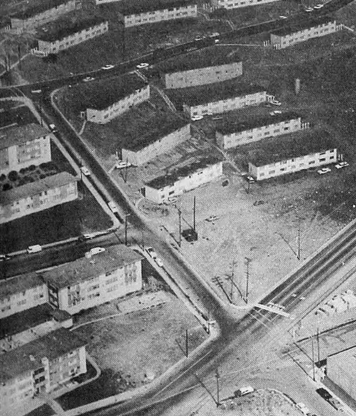Hunters Point was a food desert and housing in the Hunters Point area, especially the temporary housing erected during World War II to house shipyard workers, was dilapidated. Ruth Williams and Justin Herman called the area "worn-out" and "blighted". They described the "run-down housing with leaking roofs, sagging foundations, rotting plumbing, rodents and vermin" and concluded "no reasonable person believes that such housing should be continued in San Francisco any longer than is absolutely necessary". The surrounding area, also known as "the ridge", was also called "devoid of amenities" for the lack of grocery stores, poor schools, and limited recreation facilities.[3] State law required these temporary buildings be razed by 1970, and to ensure replacement housing could be built, the San Francisco Redevelopment Agency sent a letter to the City Controller recommending the 117 acres (47 ha) area be declared a redevelopment area. On July 30, 1962, the San Francisco Board of Supervisors appropriated US$10,773 (equivalent to $112,000 in 2024) to apply for a federal grant.[4] The two projects that had just gotten started in 1966 to alleviate the blight were known as the Butchertown and Hunters Point Redevelopment Projects.[3]