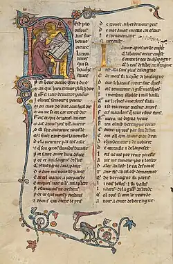 Published around 1234–1240, Li Tournoiemenz Anticrit is a psychomachia[1] drawing on both allegory and romance.[3] The forces of God array in an apocalyptic struggle against those of the Antichrist. God's troops are made up of personified Virtues, archangels, and Arthurian knights. Vices, pagan gods, and peasants fight for the Antichrist.[1]