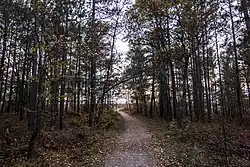 The Huron National Forest is prone to frequent seasonal forest fires, due to ecological and geological factors including the domination of the jack pine in sections the forests, the needles of which are extremely flammable,[2] sandy soil composition as a result of glacial outwash plain geology of sections of the Huron National Forest,[3] and jack pine barrens management practices to create nesting habitat for the Kirtland's warbler resulting in dense, young stands of jack pine that are extremely susceptible to crowning wildfires.[4]