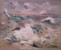 Although Marin is best known for his watercolors, beginning in the 1930s he developed an interest in the more expressive brushwork and rugged quality of oil paint. Marin was influenced by Cubism, with its flattened spaces and angularity. He honed a style of frenetic brushwork to create this dynamic image of water, wind, and clouds. He was so successful in his recreation of nature that a sailor purportedly declared it the first time he had "really seen a sea painted as the sea really is."[1]
