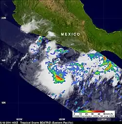 Hurricane Beatriz was a Category 1 hurricane that killed four people after brushing the western coast of Mexico in June 2011. The second named storm and hurricane of the 2011 Pacific hurricane season, Beatriz originated from an area of disturbed weather on June 19, several hundred miles south of Mexico, and gradually intensified. Gaining latitude, the system became increasingly organized and reached hurricane status on the evening of June 20. The following morning, Beatriz attained winds of 90 mph (150 km/h) as it passed roughly 15 mi (20 km) of Mexico. Due to its interaction with land, the hurricane abruptly weakened hours later. Early on June 22, Beatriz dissipated over open waters. Prior to Beatriz's arrival in Mexico, hurricane watches and warnings were issued for coastal areas. Hundreds of shelters opened across the states of Colima and Guerrero. Heavy rains from the storm triggered significant flooding along the Sabana River in Acapulco, killing four people. However, the overall effects of Beatriz were limited and the rains were largely beneficial in mitigating a severe drought.