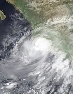 Throughout the morning of June 21, Beatriz brushed the coast of Mexico, with the center passing roughly 15 mi (20 km) south-southeast of La Fortuna, Mexico.[13] Centered just off the coast of Mexico, the system interacted with land and began weakening.[14] Hours later, convection rapidly diminished as dry air became entrained in the circulation. In response to quick degradation of the system's structure, the NHC downgraded Beatriz to a tropical storm.[15] Rapid weakening continued throughout the day and by the evening hours, the storm no longer had a defined circulation. Lacking an organized center and deep convection, the final advisory was issued on Beatriz.[16] The storm's remnants persisted for several more hours before dissipating roughly 175 mi (280 km) southwest of Cabo Corrientes, Jalisco.[17]