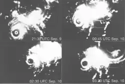 During the evening of September 9, Beulah turned westward as weak ridge developed over the Bahamas, between it and the newly formed Tropical Storm Doria.[3] The powerful storm weakened somewhat as an eyewall replacement cycle began to take shape. During this phase, the inner-eye of Beulah contracted to roughly 3–4 mi (4.8–6.4 km) in diameter while a second eyewall spanned an area 28 mi (45 km) across. The smaller eye soon dissipated, and the larger one became the single, dominant feature by the morning of September 10. The completion of this process marked the first time that an eyewall replacement cycle was observed in its entirety.[4] The aforementioned westward turn placed the Dominican Republic in the line of danger, an area still reeling from the devastating effects of Hurricane Inez just one year prior. However, the storm unexpectedly collapsed as it approached the Barahona Peninsula and struck the area as a greatly weakened, though still significant, Category 1 hurricane, with estimated winds of 90 mph (140 km/h) around 18:00 UTC on September 11.[3][2]