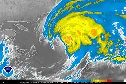 Later on August 22, the storm weakened to a Category 1 hurricane as Bill tracked over cooler waters.[21] The storm maintained its intensity through August 23 as it retained its cloud-filled eye and tracked at a quick pace to the north-northeast producing 26.4 m (87 ft) waves at La Have Bank Buoy (station 44142) 42°30′N 64°01′W / 42.5°N 64.02°W[22] and 16 ft surge on coastlines in New England and Nova Scotia.[23] The storm then made landfall shortly before midnight local time, at Point Rosie, on the Burin Peninsula of Newfoundland as 70 mph (110 km/h) tropical storm.[24] Shortly after this it was downgraded to a tropical storm, and then lost tropical characteristics.[25] The remnants of Bill crossed the Atlantic Ocean as an extratropical storm and later impacted the United Kingdom with heavy rain and surf.[26] On August 26, the remnants of Hurricane Bill were absorbed by a larger extratropical cyclone, near the British Isles.[24]