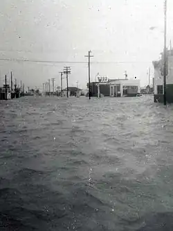Shortly after the storm, Vice President Lyndon B. Johnson, a lifelong resident of Texas, toured the devastation in the state and met with officials from 18 different counties, remarking that "as always, Texans are arising to a challenge... We have suffered hurricane, tornado, and floods, but we in Texas are a bold and brave people."[32] After his report to President John F. Kennedy and Congress, $55 million was approved in aid for Texas, though Kennedy later requested an additional $65 million.[33] President Kennedy issued a disaster declaration for Texas, allowing all jurisdictions in the state to apply for public assistance.[34] The president also declared 6 parishes in Louisiana a disaster area.[33] Helicopters deployed 88 United States Marines to Galveston to patrol devastated areas. A United States Navy task force composed of medical and construction work teams was also sent to the area. Members of the United States National Guard assisted refugees in returning to their homes and worked to prevent looting.[35]