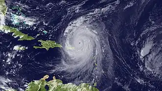 Hurricane Earl's outflow steadily improved through August 30 and sustained winds rose above 100 mph (160 km/h), making Earl a Category 2 storm.[16] Around 1200 UTC, the center of Earl passed roughly 25 mi (40 km) east-northeast of St. Martin with sustained winds of 110 mph (180 km/h).[17] Several hours later, the storm further intensified into a major hurricane.[18] That afternoon, Earl became a Category 4 hurricane, attaining winds of 135 mph (217 km/h) before leveling out in intensity.[19] A northwestward track began to become apparent by this time as the system neared the southwestern periphery of a subtropical ridge over the Atlantic Ocean.[20] Early on August 31, an eyewall replacement cycle, a process in which a storm's eye dissipates and is replaced by a larger one, began to take place.[21] Despite increasing wind shear, the system maintained its intensity through September 1,[22] when it briefly weakened to a Category 3 system.[23] Gradual strengthening took place throughout the day as the eye became better defined and convection deepened around the center. Additionally, the storm began to turn northward in response to the ridge over the Atlantic and a strong trough over the Great Lakes.[24] Hurricane Earl later attained its peak intensity during the morning of September 2 with winds of 145 mph (233 km/h) and a barometric pressure of 928 mbar (hPa; 27.40 inHg).[25]