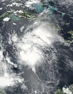 While passing south of the Dominican Republic on August 1, the system became much better organized, producing tropical storm-force winds in its northern periphery.[11] The fast forward motion allowed the system to develop despite an increase in upper-level wind shear, although the shear decreased as water temperatures increased along the wave's path.[12] A Hurricane Hunters mission was scheduled to fly into the system on August 1, but it could not investigate because of mechanical problems.[13] Early on August 2, the system passed south of Jamaica,[14] and a Hurricane Hunters flight was able to observe a closed circulation. As a result, the NHC classified the system as Tropical Storm Earl at 16:00 UTC that day, located 215 mi (350 km) south-southeast of Grand Cayman and situated between Jamaica and northeastern Honduras.[15]