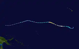 With favorable conditions, the depression quickly intensified into a tropical storm; upon doing so, it was named Ekeka by the CPHC, which is Hawaiian for Edgar. Ekeka continued gradually intensifying while moving slowly west-northwestward, and it attain hurricane status on January 30 about 100 miles (160 km) northwest of Palmyra Atoll. On February 2, the hurricane attained peak winds of 115 mph (185 km/h), making Ekeka a major hurricane, or Category 3 hurricane on the Saffir–Simpson scale.[2] Subsequently, it began to weaken due to increased wind shear, and concurrently its forward motion increased as the subtropical ridge strengthened to the north of the hurricane.[3] A large trough in the Westerlies increased the wind shear, which weakened Ekeka to a tropical storm early on February 3. Later that day, it crossed the International Date Line into the western Pacific Ocean;[2] both of the Joint Typhoon Warning Center (JTWC) and the Japan Meteorological Agency (JMA) assessed the storm's winds at 50 mph (80 km/h).[3][5] Shortly before that, the JMA assessed the pressure as 985 mbar, which is the lowest known minimum central pressure associated with the storm;[5] the CPHC did not include pressure in their year-end report.[2]