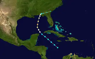 After turning north and entering the Gulf of Mexico, Florence quickly intensified, with the Hurricane Hunters estimating winds of 125 to 140 mph (201 to 225 km/h).[1] However, the official peak intensity was later reanalyzed as 115 mph (185 km/h), along with a pressure of 968.0 mb (28.59 inHg),[2] as the estimate of the peak winds was considered to have been too high, as ships in the region did not confirm them.[1] On September 26, it began quickly weakening, due to a combination of colder water temperatures and cool air.[3] At around 1800 UTC that day, Florence made landfall in a sparsely populated area between Fort Walton and Panama City Beach, Florida with winds of 80 mph (130 km/h). Within six hours after moving ashore, the hurricane had transitioned into an extratropical cyclone near the borders of Florida, Alabama, and Georgia.[1][2] The remnants of Florence turned the northeast along a cold front, crossing Georgia before emerging near Savannah. The storm paralleled the Carolinas just offshore, dissipating on September 28 southeast of New England.[4][2]