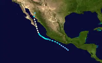 Henriette continued to improve in structure and with the formation of a distinct eye feature, reached hurricane strength on September 4 as it turned north-northwestward toward the Baja California peninsula, ahead of a mid-latitude trough approaching the west coast of the United States.[5] The hurricane reached its peak intensity of 85 mph (135 km/h) that morning while centered about 75 miles (120 km)south-southeast of Cabo San Lucas.[1]