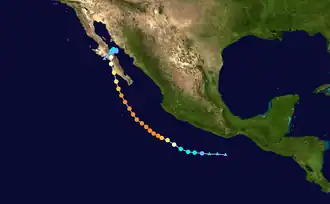 Early on August 31, about 54 hours prior to landfall, the Government of Mexico issued a hurricane watch from Bahía Magdalena to San Evaristo in Baja California Sur.[16] A state of emergency was declared in five districts of Baja California Sur requested via the local government.[17] In La Paz, residents rushed to get groceries before the stores closed and residents boarded up windows.[18] In Los Cabos, residents frantically stocked up on supplies before the tropical cyclone struck.[17] On August 31, civil defense authorities in Los Cabos announced that they would have to evacuate 20,000 families from their homes.[19] Officials urged a total of 10,000 people to evacuate from shacks. Most people evacuated; however, they feared that there items would be stolen if they had left.[20] While they did struggle with evacuations, officials managed to evacuate 15,000 people living in hurricane prone areas. However, many people such as tourists and the poor failed to evacuate, though 2,000 foreigners did leave the Los Cobos area.[17] On August 30, Robbie Berg from the National Hurricane Center noted that the hurricanes remnants may help fire relief in California and also interests Baja California should monitor the progress of the system.[21]