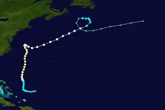 Hurricane Josephine was a long-lived Atlantic hurricane that threatened the East Coast of the United States for several days in October 1984. The sixteenth tropical cyclone, tenth named storm, and third hurricane of the season, Josephine developed from an area of disturbed weather near the Bahamas on October 7, forming with subtropical characteristics. It quickly organized, and gained tropical characteristics as it strengthened into a tropical storm on October 8. Gradual intensification occurred thereafter, reaching hurricane status on October 10. The storm headed northward, remaining well offshore of the eastern United States. Josephine strengthened further and peaked as a moderately strong Category 2 hurricane on the Saffir-Simpson Hurricane Scale on October 12. On the following day, Josephine weakened back to a Category 1 hurricane before becoming nearly stationary. It later headed northeastward and paralleled the coast well offshore of Nova Scotia. By October 17, Josephine weakened back to a tropical storm, shortly before beginning to execute a cyclonic loop to the south of Newfoundland. While executing the cyclonic loop, Josephine became extratropical on October 18.
